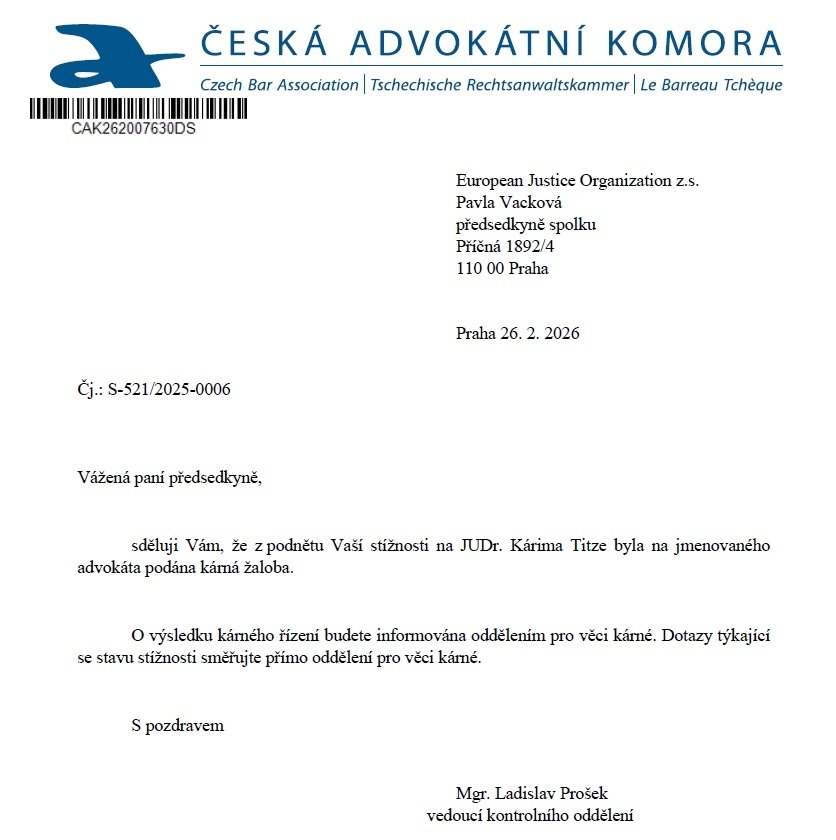 European Justice Organization z.s. (EJO) informuje, že Česká advokátní komora (ČAK) potvrdila podání kárné žaloby na advokáta JUDr. Kárima Titze. ČAK ve svém oznámení uvádí, že kárná žaloba byla podána z podnětu stížnosti EJO.