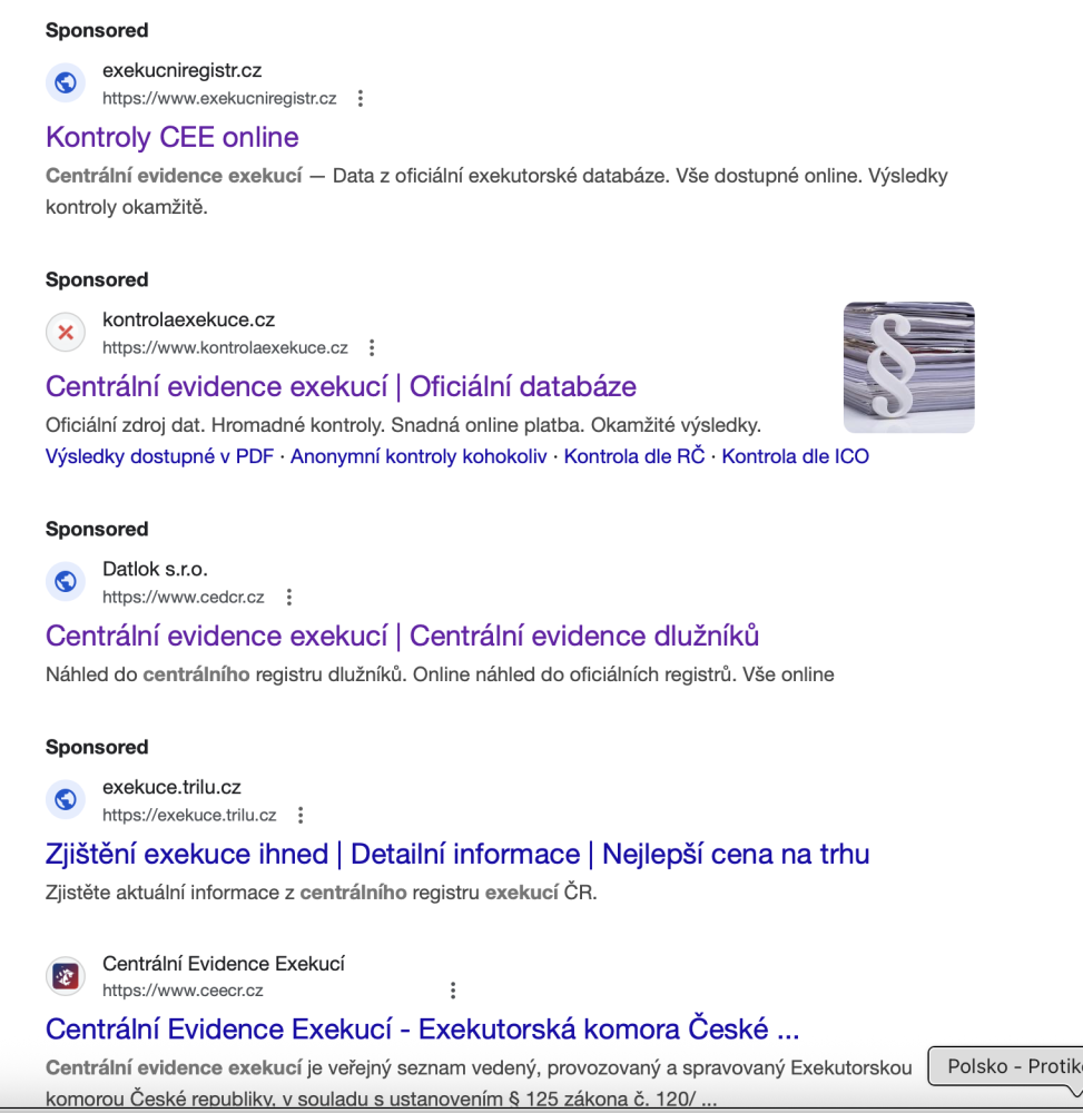 Když si zadáte do vyhledávače „kontrola exekuce“ nebo „výpis z registru exekucí“, na prvních místech se vám neukáže web Exekutorské komory, ale placené reklamy soukromých firem, které prodávají výpisy za násobky skutečné ceny. Předstírají přitom, že jsou oficiálními databázemi.