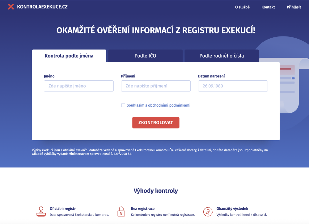 Web Kontrolaexekuce.cz, provozovaný osobou Vladimír Stěhule (spojen s firmou GetData s.r.o.), je typickým příkladem: za 218 Kč nabídne anonymní výpis „z oficiální evidence“, přestože není autorizovaným portálem Exekutorské komory ČR. Ve skutečnosti přeprodává výstupy z oficiální databáze, často roboticky a bez transparentních podmínek.