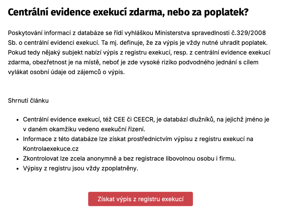 „Výpisy exekucí jsou z oficiální exekuční databáze vedené a spravované Exekutorskou komorou ČR. Veškeré dotazy, i detailní, do této databáze jsou zpoplatněny na základě vyhlášky vydané Ministerstvem spravedlnosti č. 329/2008 Sb.“