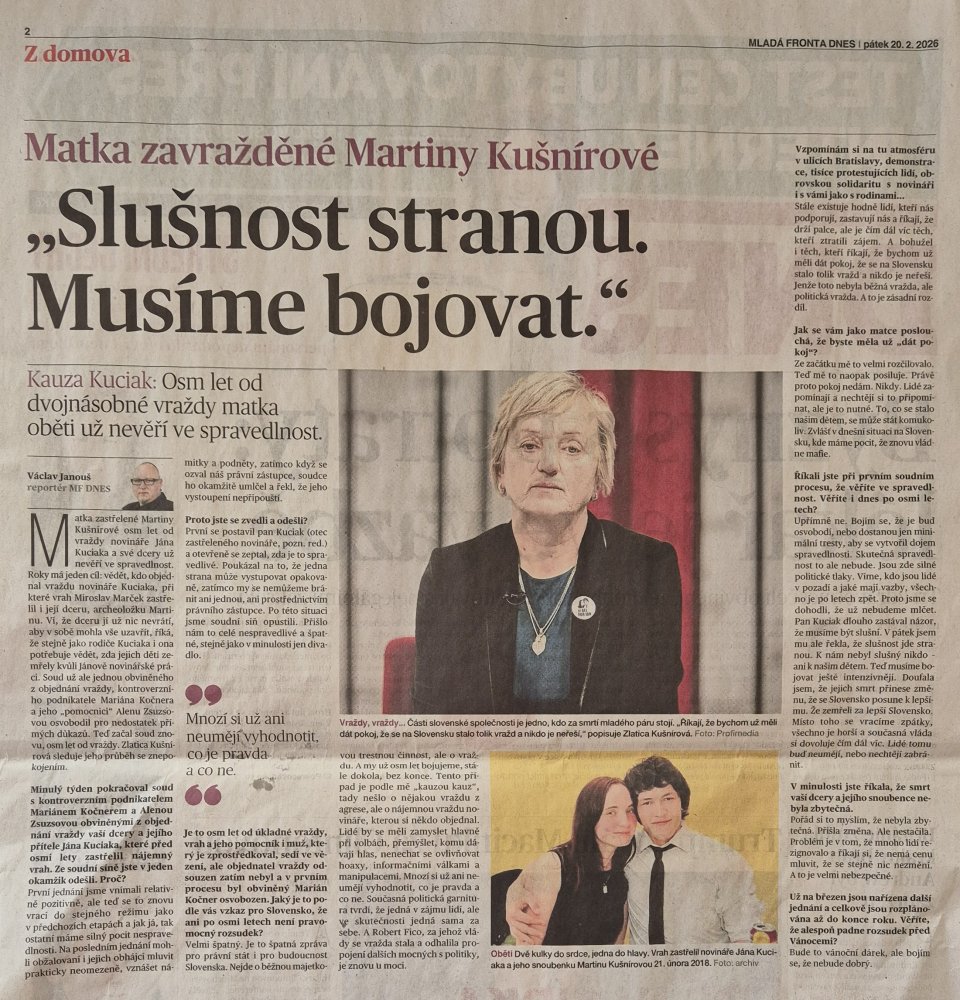 Z článku v příloze: Minulý týden pokračoval soud s kontroverzním podnikatelem Marianem Kočnerem a Alenou Zsuzsovou obviněnými z objednání vraždy vaší dcery a jejího přítele Jána Kuciaka, které před osmi lety zavraždil nájemný vrah. Ze soudní síně jste v jeden okamžik odešli. Proč?“