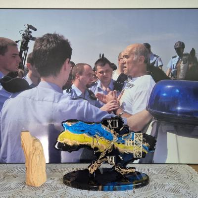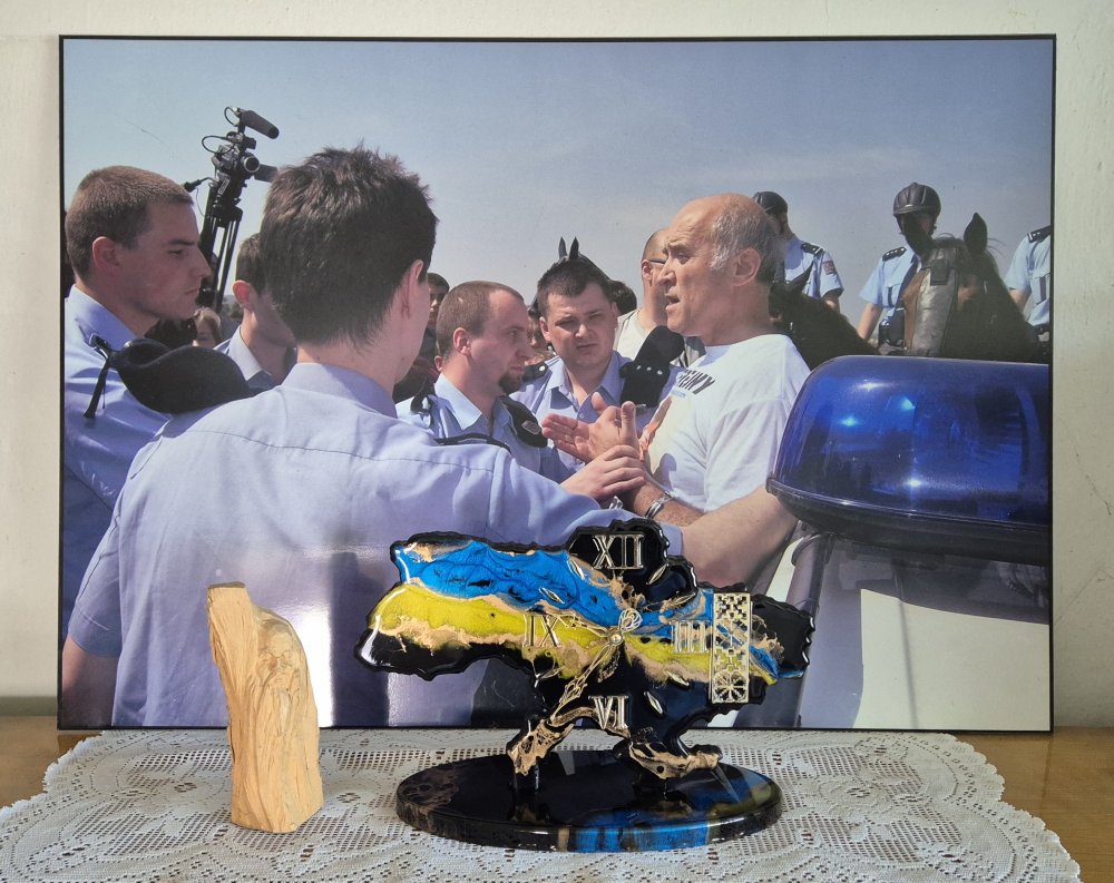 Neodolal jsem a zakoupil hodiny s mapou Ukrajiny. Tvar hodin připomíná lva, který se postavil Rusku a současně je připraven připojit se k Západu a jeho hodnotám. Symbolicky nyní odtikávají čas pod fotografií z 1.Máje 2005 v mém bydlišti. Tehdy mne nechal zatknout na Letenské plání v Praze předseda KSČM Miroslav Grebeníček. Obraz ohroženého děťátka namaloval ukrajinský umělec. Dražil se 8.5.2023 na podporu vojáků Ukrajiny – dražbu jsem nemohl nevyhrát! Od té doby jej shlédly stovky dětí, zaujal je.