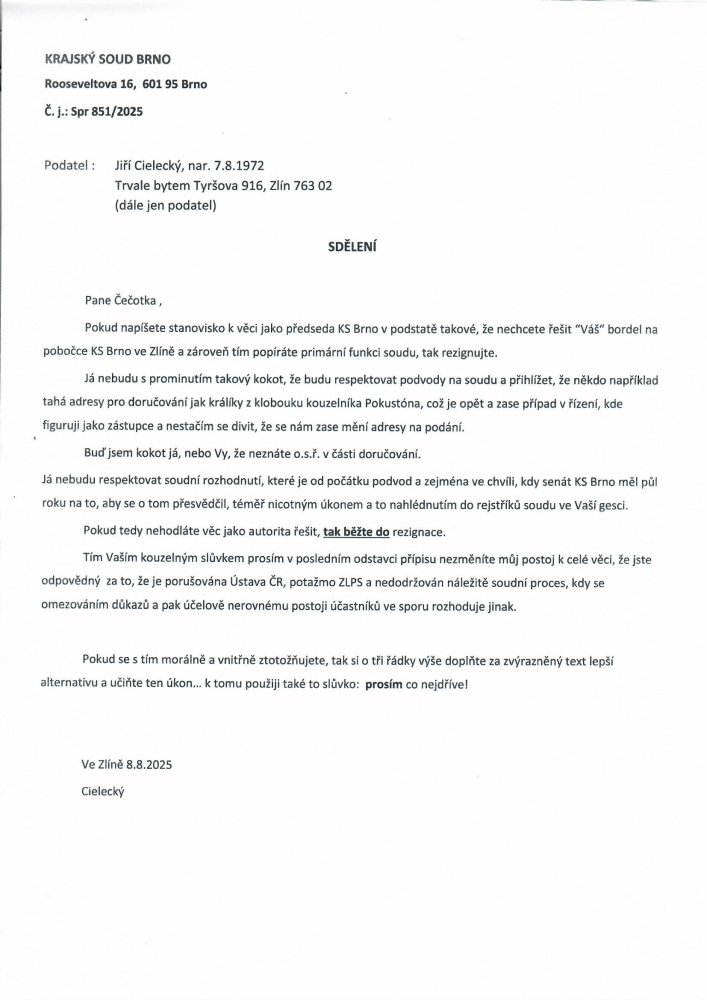 V přílohách reakce pana Jiřího Cieleckého (8.8.2025) na jeho stížnost na předsedy soudů k rukám předsedy KS Brno JUDr. Milana Čečotky a jeho odpověď (31.7.2025). JŠ