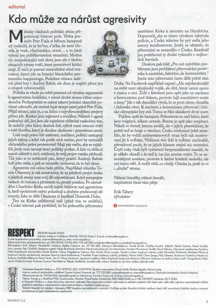 Koupil jsem si poslední číslo (60 kč), kde mne úvodní, takřka aktivistické slovo šéfredaktora, dost překvapilo – viz příloha. Obdržel cenu Ferdinanda Peroutky v roce 2008 (tuším jeho pradědečka). Snad si ji tehdy zasloužil, ale za dnešní „výkony“ těžko…