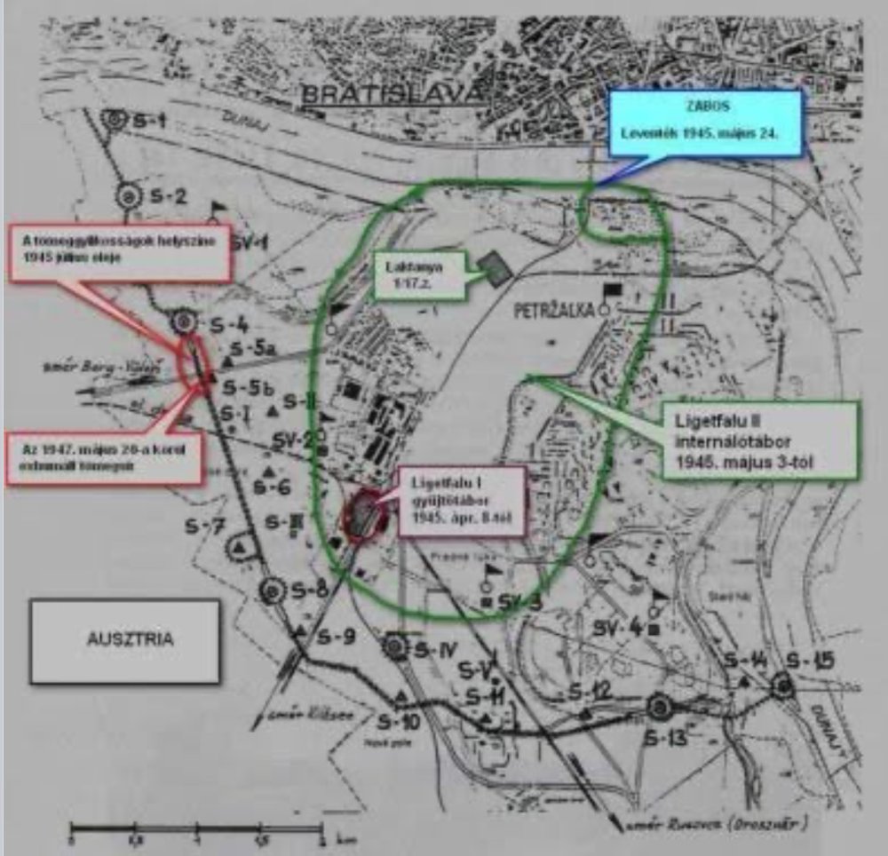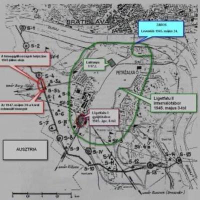 Zajímavá mapka – vit příloha - ,,Staré fotografie z města Šamorín“. Červeně je označen masový hrob a místo, kde bylo v pevnostním systému exhumováno 90 Levantčanů. Jsou označeny tři tábory. Ten nejblíže k Dunaji je vyhlazovací tábor, kam byli od 24. května 1945 nahnáni mladí chlapci (vraceli se z nuceného nasazení v Německu). Ten nejblíže k rakouským hranicím je sběrný tábor, kam byli od 8. dubna 1945 posíláni ti, kterým byly zabaveny domy a byty. Od 3. května byli do internačního tábora shromažďováni lidé z okolních maďarských vesnic. Rusové je odváděli na Malenkyj robot. Kasárna jsou také označena. Druhá fotografie (v příloze se seznamem) pochází od Judit z Venezuely. I ona byla na seznamu zapsaných. Její otec byl řezník, soudruh G. partyzán, chtěl jejich dům a podnik, proto skončili v táboře. JŠ