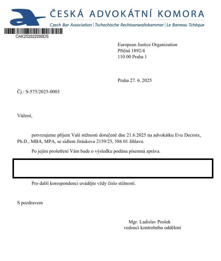 Podle písemného potvrzení ČAK byla stížnost doručena 21. června 2025 a od jejího přijetí má komora zákonnou lhůtu na prověření všech okolností. „Po prošetření vám bude o výsledku podána písemná zpráva,“ uvádí se v dopise vedoucího kontrolního oddělení Mgr. Ladislava Proška. Číslo stížnosti musí být uvedeno ve veškeré další korespondenci.