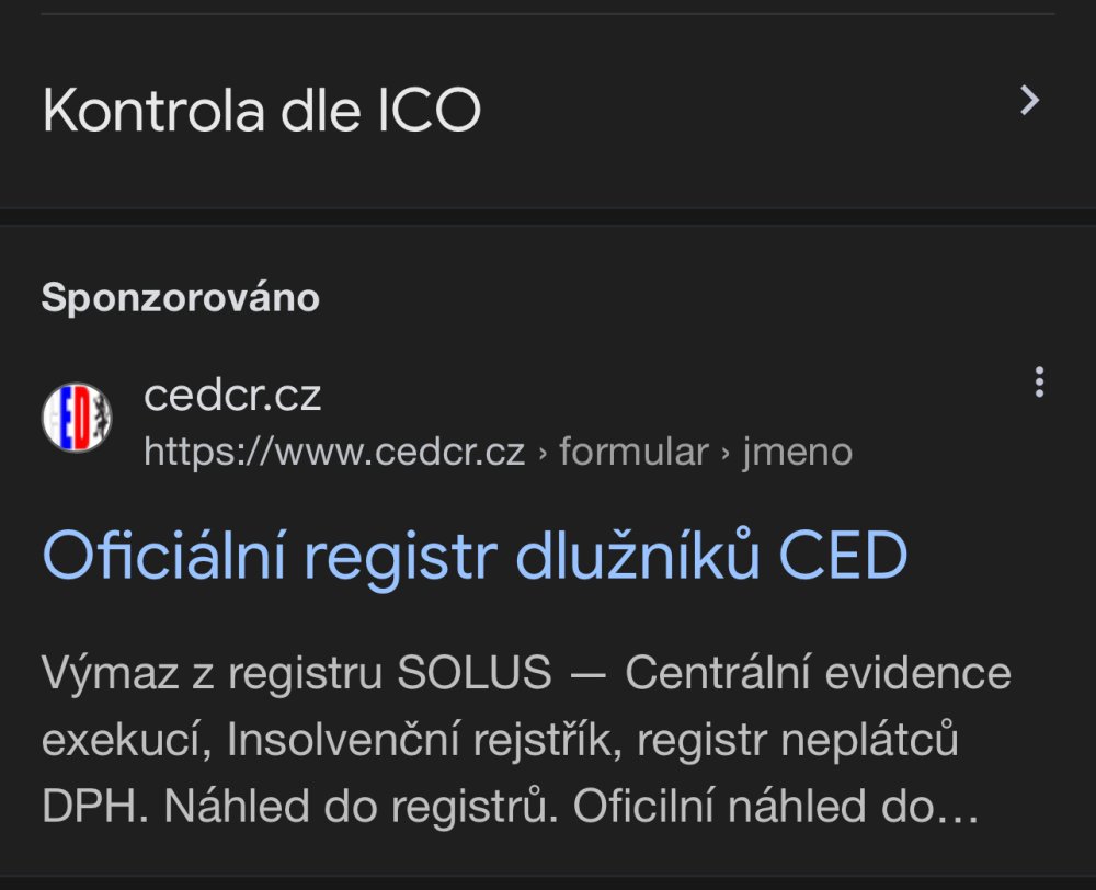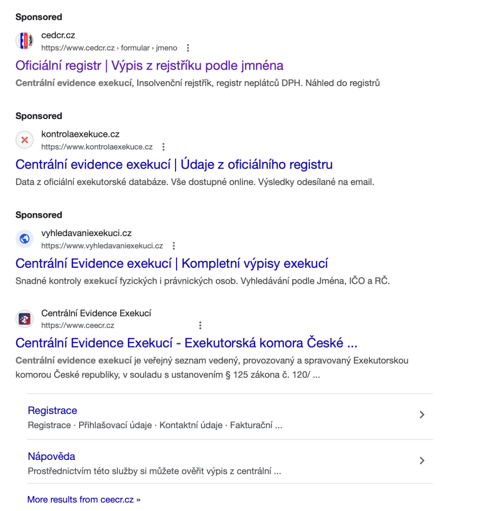 Když si zadáte do vyhledávače „kontrola exekuce“ nebo „výpis z registru exekucí“, na prvních místech se vám neukáže web Exekutorské komory, ale placené reklamy soukromých firem, které prodávají výpisy za násobky skutečné ceny. Předstírají přitom, že jsou oficiálními databázemi.