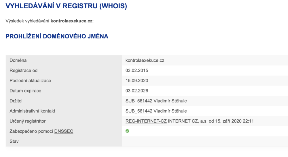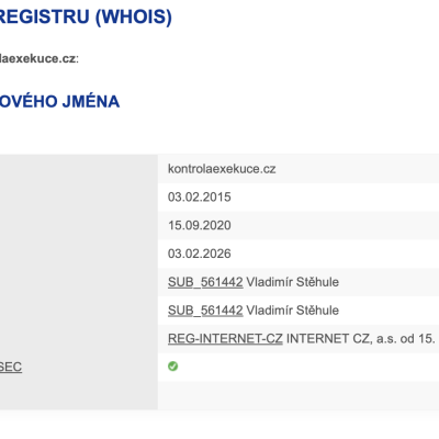 👉 Faktický stav: Web není spravován Exekutorskou komorou ČR, ani není její oficiální službou. Doména patří soukromé osobě (viz WHOIS: Vladimír Stěhule), provozováno firmou GetData s.r.o., přičemž reálně pouze přeprodává oficiální výpisy za navýšenou cenu a bez přímého propojení s komorou.