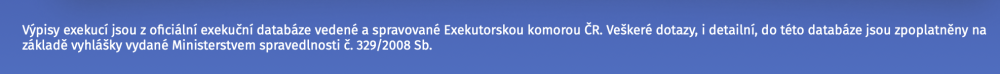 „Výpisy exekucí jsou z oficiální exekuční databáze vedené a spravované Exekutorskou komorou ČR. Veškeré dotazy, i detailní, do této databáze jsou zpoplatněny na základě vyhlášky vydané Ministerstvem spravedlnosti č. 329/2008 Sb.“