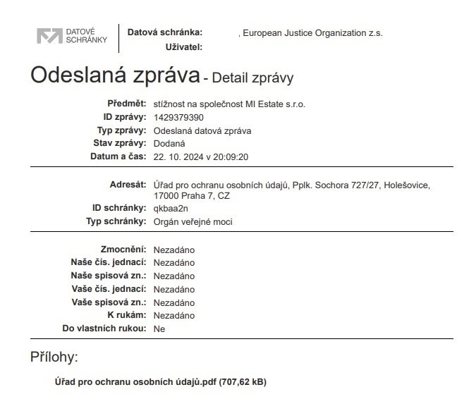 Hromadná stížnost na MI Estate s.r.o. a fyzické osoby pro podezření z porušení pravidel GDPR k ÚOOÚ