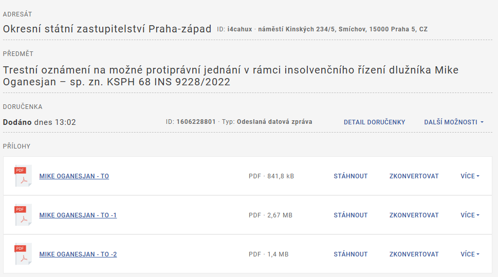 European Justice Organization dnes podala k Okresnímu státnímu zastupitelství Praha-západ trestní oznámení na Mikea Oganesjana (IČ 05298032), dlužníka v insolvenčním řízení vedeném pod sp. zn. KSPH 68 INS 9228/2022 u Krajského soudu v Praze.