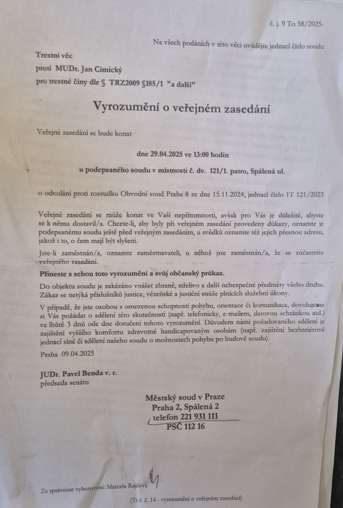 MS Praha 29.4.2025: „Utajený svědek“ v kauze MUDr. Jana Cimického promluvil