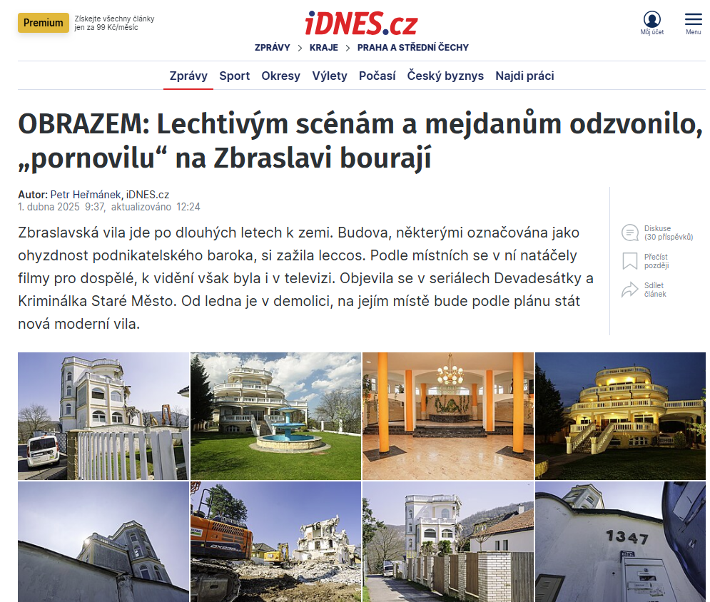 Zbraslavská vila, která si vysloužila přezdívku „pornovila“, jde po letech k zemi. Podle médií se v ní natáčely filmy pro dospělé, odehrávaly večírky a zároveň posloužila jako kulisa televizních seriálů. Její bourání popsala například redakce iDNES jako konec jedné éry podnikatelského baroka a lechtivých historek.
