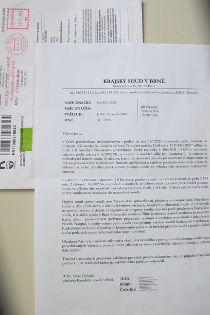 V přílohách reakce pana Jiřího Cieleckého (8.8.2025) na jeho stížnost na předsedy soudů k rukám předsedy KS Brno JUDr. Milana Čečotky a jeho odpověď (31.7.2025). JŠ