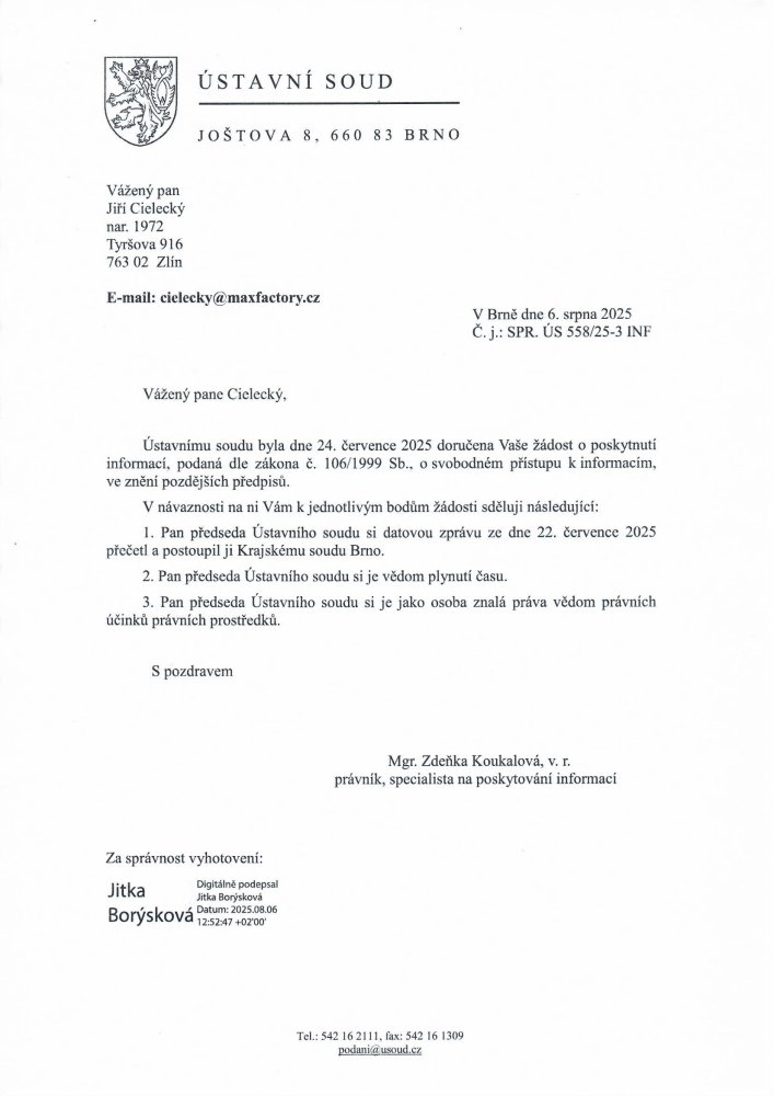 Odpověď specialistky Ústavního soudu ČR na poskytování informací právničky Mgr. Zdeňky Koukalové (6.8.2025) na otázky (22.7.2025) dle zákona č. 106/1999 Sb. o svobodném přístupu k informacím. Další otázky byly zaslány (6.8.2025) – viz text níže. Formulace odpovědi Mgr. Koukalové je značně opatrná a znepokojivá. Věřme, že u Ústavního soudu ČR je stále většina soudců, kteří korupčním tlakům nepodlehnou. JŠ