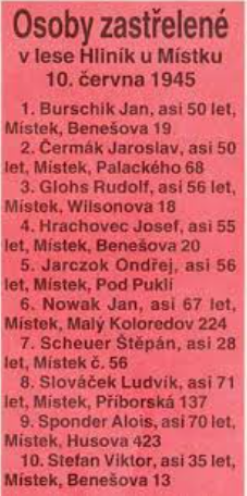 Nejedná se o nijak veliký počet obětí, vždyť v dnešních časech zahyne v této zemi při dopravních nehodách týdně občas i osob víc. Před rokem, s příležitostí oslav Velikého Listopadu, jsem přesto písemně oslovil místního primátora návrhem, zdali by nebylo důstojné v roce 2025 v lese Hliník k jubileu 80 let od excesů zřídit tamtěm bez zákona popraveným památník. Dodnes jsem však na můj dotaz rok žádnou odpověď neobdržel.