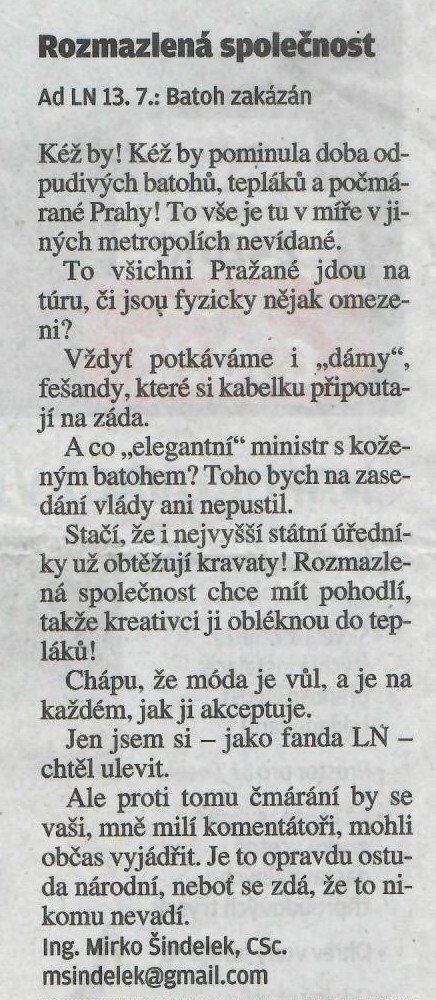 Na poslední chvíli se dostavil i prof. JUDr. Jan Kuklík, Dr.Sc., prorektor Univerzity Karlovy a děkan právnické fakulty UK. Byl jsem v šoku – zpod saka mu zezadu koukala košile až do kolen (měl rifle!). Bylo to na poslední chvíli, kdy byl pro mne už „nedosažitelný“. Proto jsem ho ani nestačil upozornit a vyfotografovat. Krátce jsem s ním při příchodu hovořil (známe se roky). Snad se někdo ještě včas našel a zabránil mezinárodní ostudě? Při odevzdání kabátu si toho šatnářky nemohly nevšimnout, byl sám, mlčely… I on je dalším příkladem zdeformované doby, která vede i k takovýmto nevědomým excesům. Ve FOTOGALERII naleznete i trefný komentář o úpadku „oblékací kultury“ v naší zemi ing. Mirko Šindeleka, CSc (LN 13.7.2024).